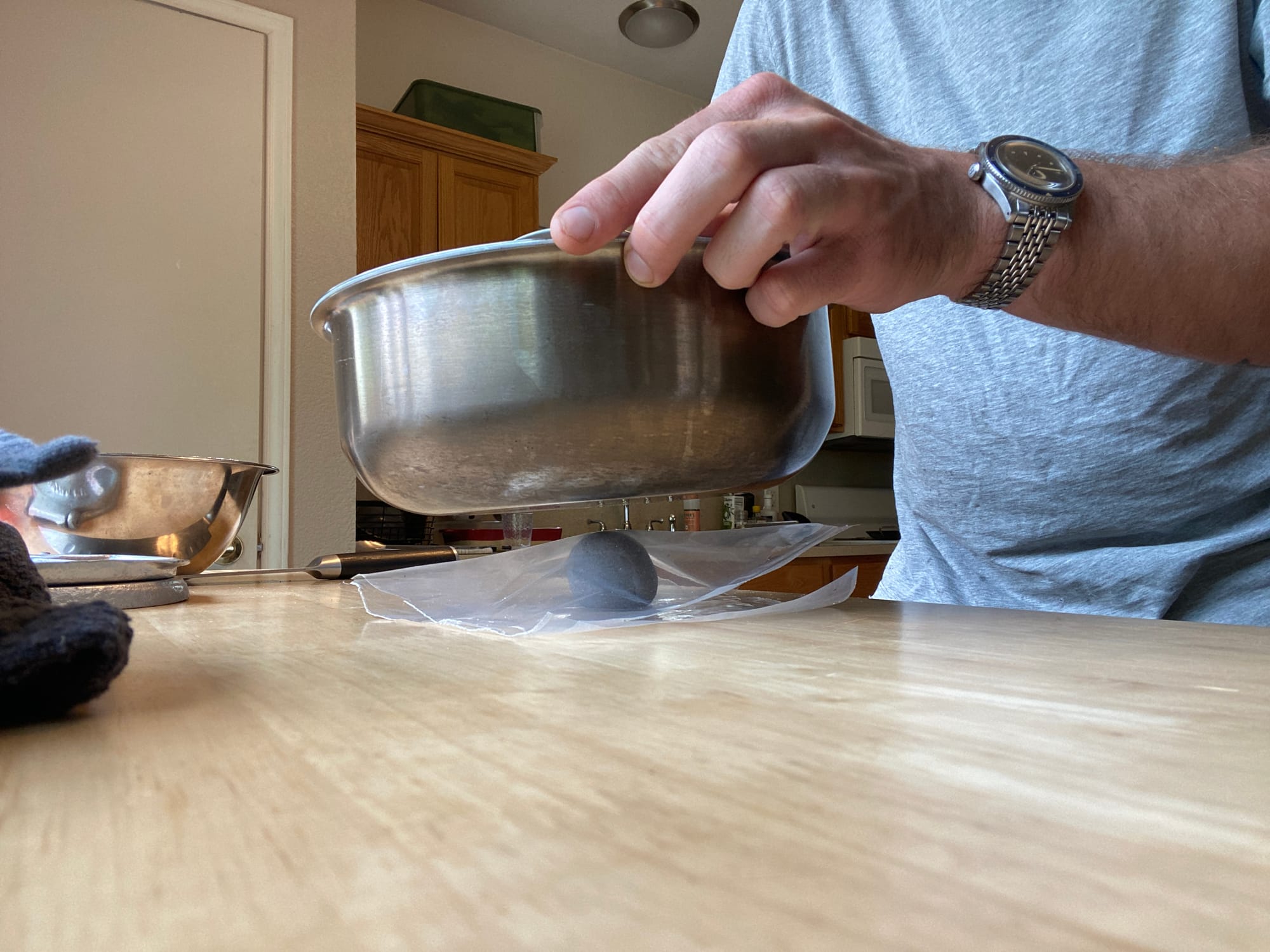 You can do the same thing with the flat half of the back of a pot or pan. Simply press down forcefully to flatten out the tortilla evenly.